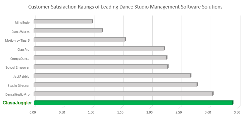 When it comes to choosing software for managing your business, bigger isn’t always better. In a recent survey that compared overall customer satisfaction, ClassJuggler earned customer satisfaction ratings as much as 325% higher than its larger competitors.