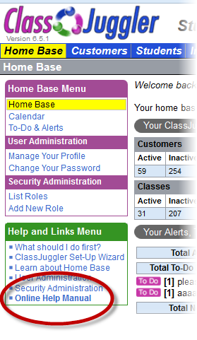 This article is just a highlight explanation of the manually applied credit or payment features. Our help files within ClassJuggler go into more detail and provide more example scenarios. To see these, log in to your account, then click on Online Help Manual (see image below) and then search for “manually applied credit.”