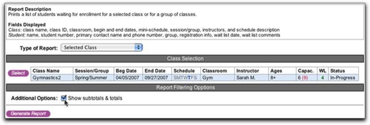 ClassJuggler has a helpful report tool you’ll want to learn to use: the Class Wait List. This report prints a handy list of enrollees for a selected class or for a group of classes.