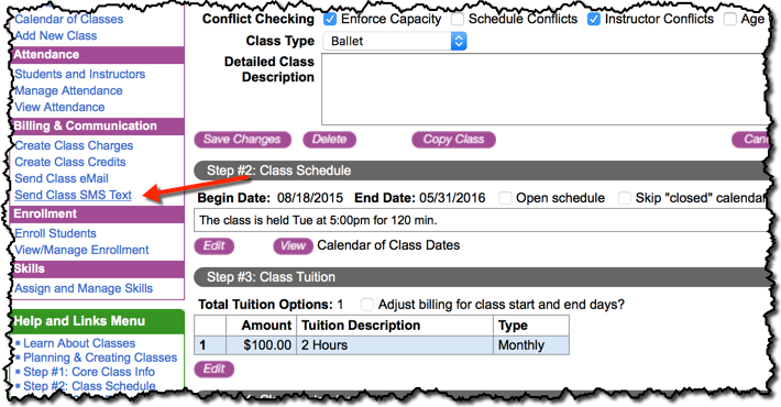 For example, we mentioned targeting only parents whose children attend a singe class with a text message. You do this simply by selecting the class you want to work with, then choosing Send Class SMS Text from the Class menu: