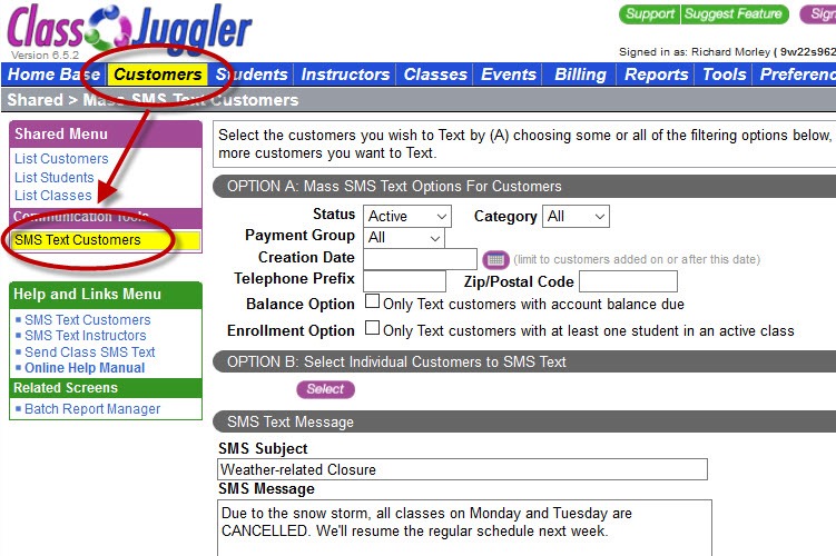 - Use our robust ClassJuggler Help to learn about SMS Messaging.