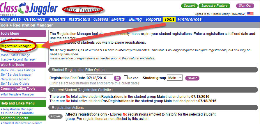 Do you have a specific Student group in which you want the registrations to all expire on the same day? Or maybe you want to manually expire all your registrations just before or after your summer sessions. Then it’s time to use your ClassJuggler Registration Manager tool, which allows you to easily mass-expire your student registrations.