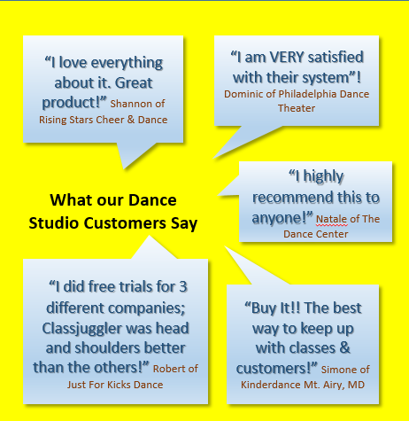 - “I did free trails for three different companies, and ClassJuggler was head-and-shoulders better than the others!” (Robert of Just for Kicks Dance)