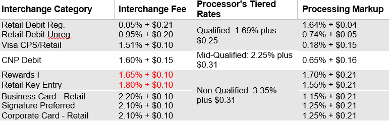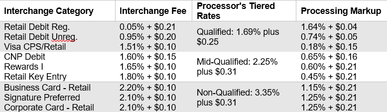 The table below shows how a processor might organize nine common Visa interchange categories under a tiered pricing model for a retail business.