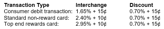 The table below shows three of the most common card categories along with their Interchange cost. Note how the discount, or profit, is the same regardless of the card used.